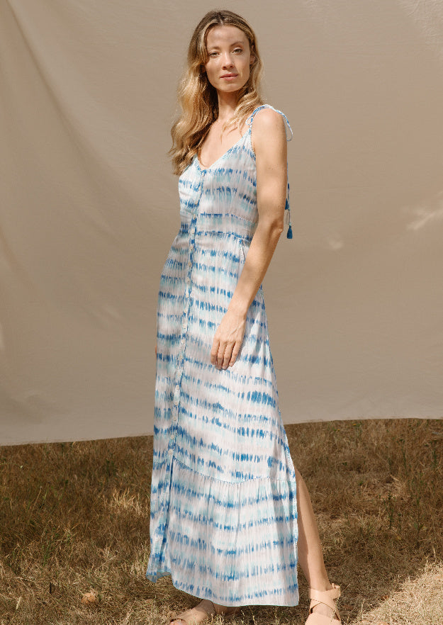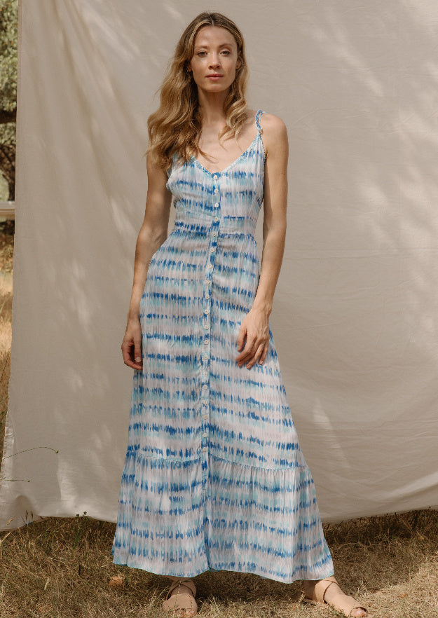 A high-level summer dress that can even be worn with other clothes underneath. Long and with blue dots in different shades that reflect the light and summer sun very well. Half-forearm sleeves and a neckline at the mid-chest point.