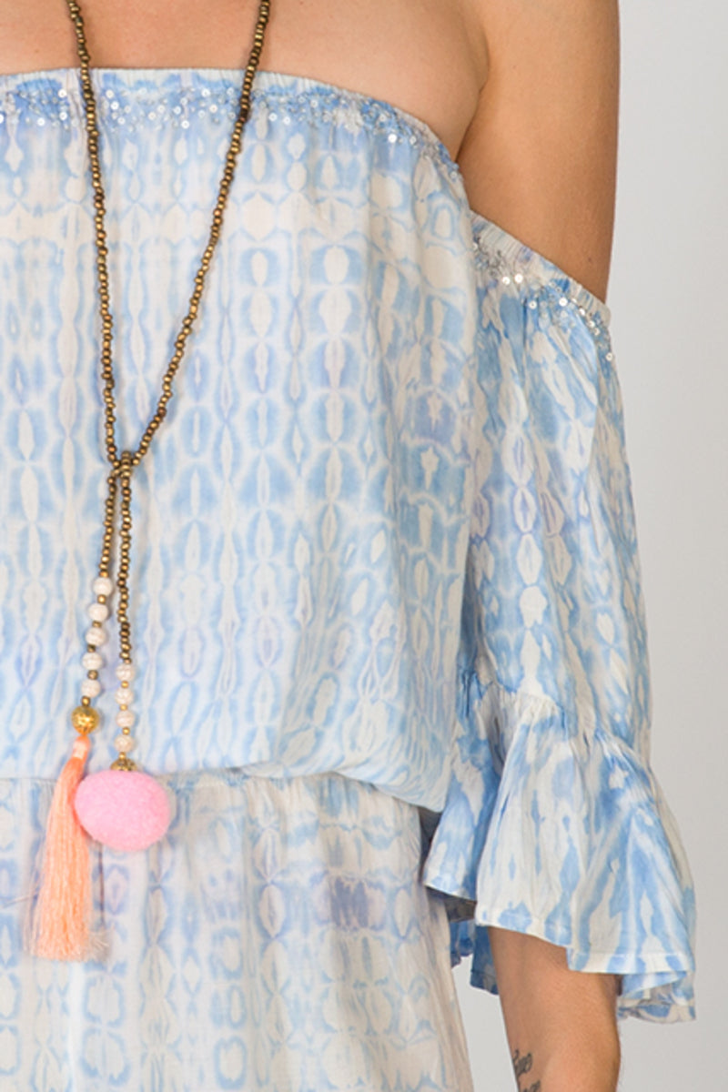 El mono boho chic Alina es una pieza con estampado Baltik artesanal en tonos azules agua.