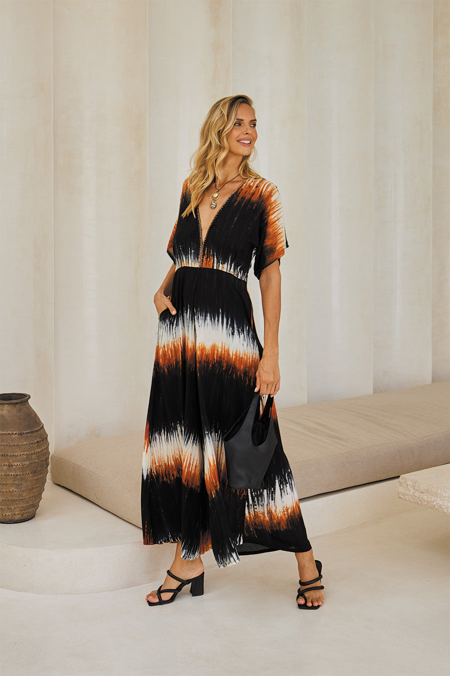 The Regalia Long Jumpsuit in Color Burst Tie Dye is bold and graceful. With a black, white and terracotta palette, wide legs and handcrafted beadwork, it brings a modern boho edge to every occasion.