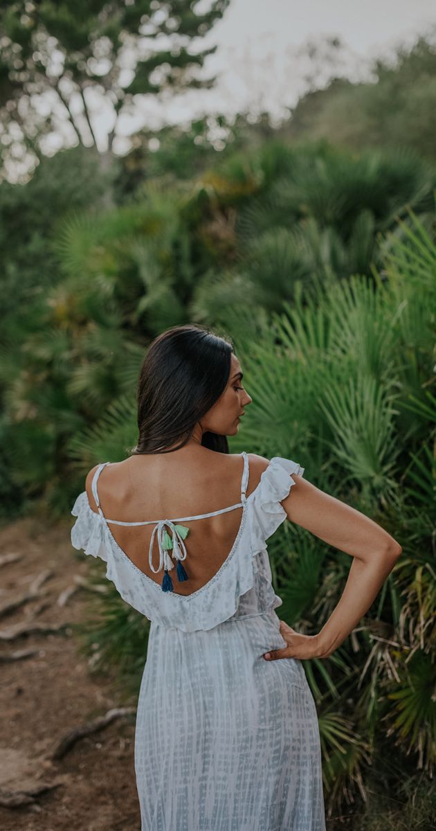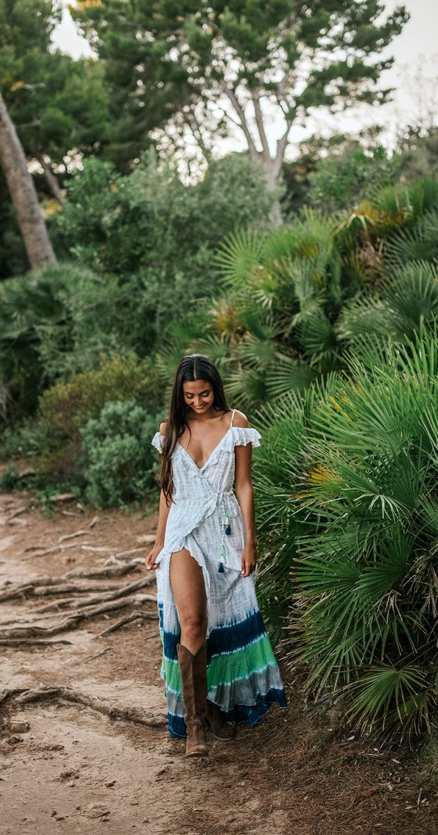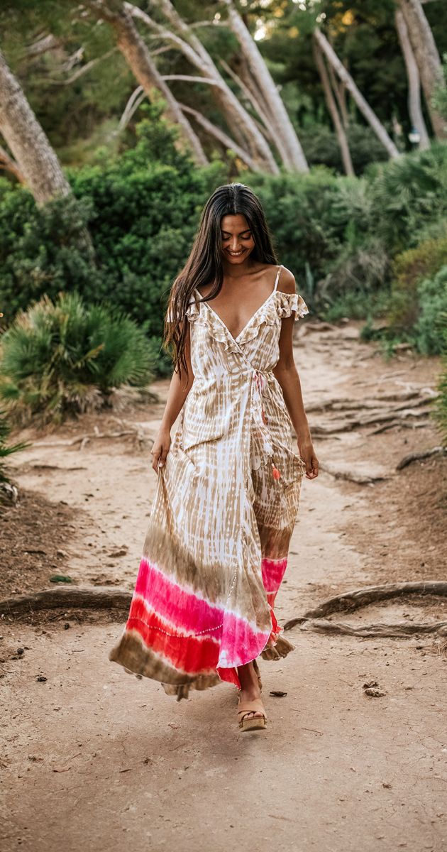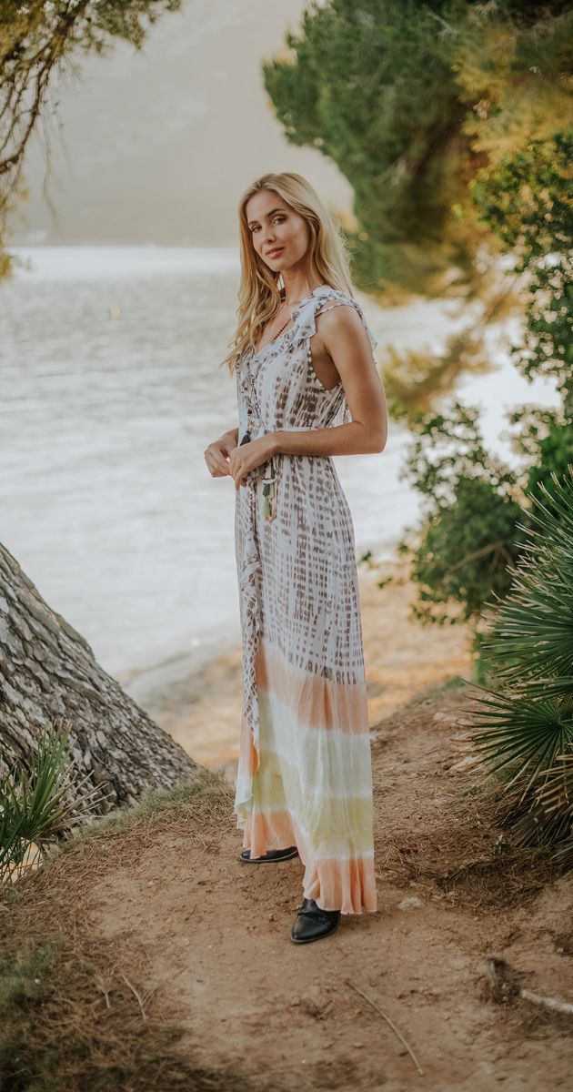 El Impresionante vestido Sylvia largo, teñido a mano con su espalda abierta y hombros sexy, es uno de nuestros artículos básicos SS19.