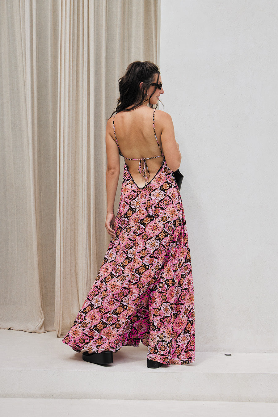 The Aurora Long Dress in psychedelic pink and black is a vision of bold elegance. With handcrafted lace, flowing fabric and a deep neckline, it’s made to move with you — from sunrise rituals to moonlit escapes.