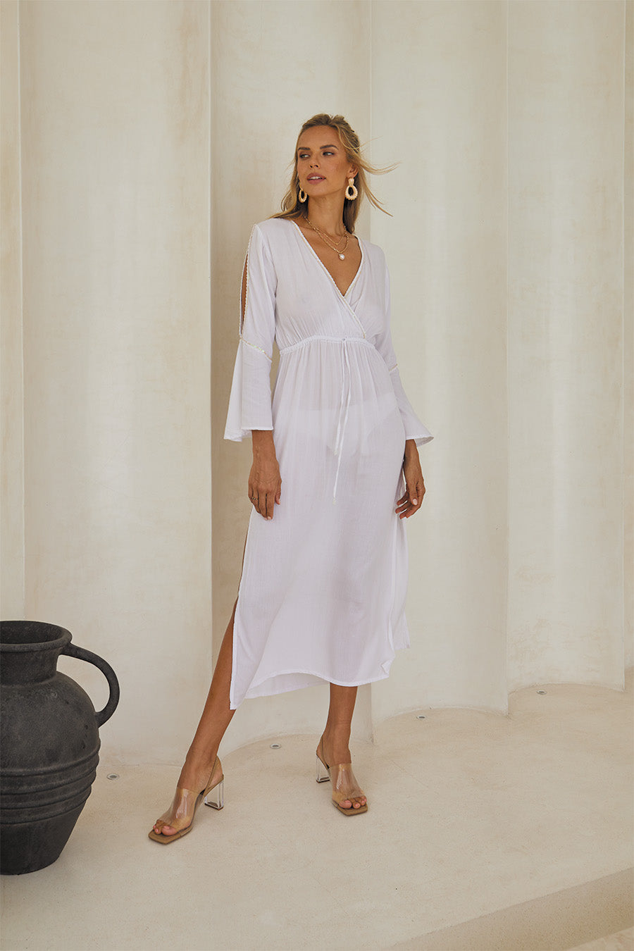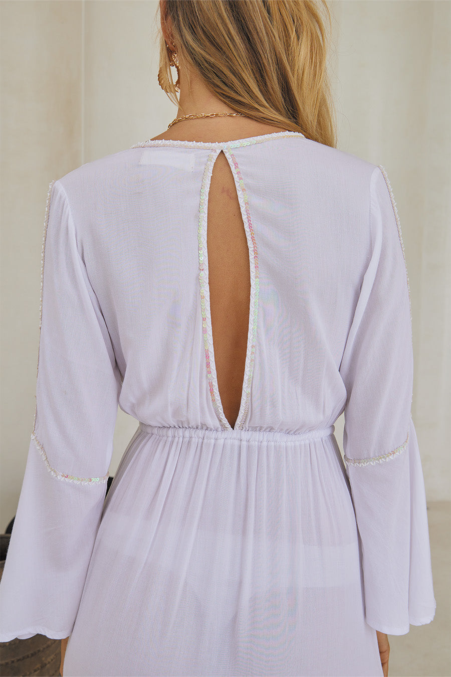 The Blossom Dress is all flow, freedom and romance. With a deep V neckline, open back and hand-applied lace, it’s made for dancing, dreaming, and drifting through golden hours.