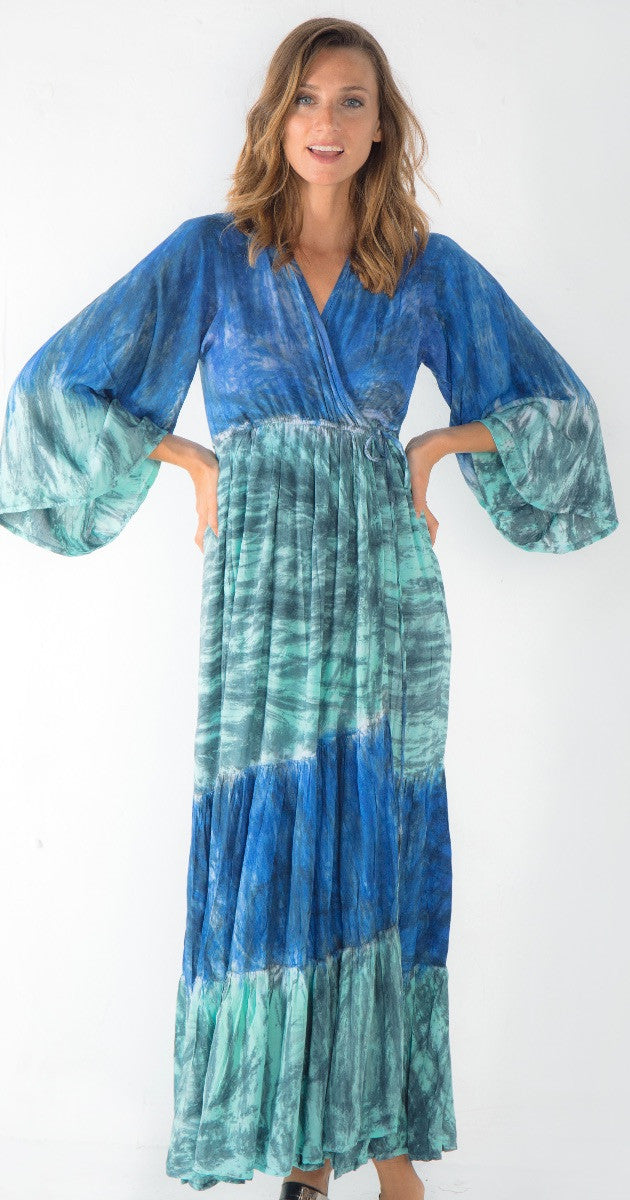 Eritha tunique is the perfect outfit for your beach summer vacation. Hand dyed in a beautiful batik style, features glamourous bell sleeves, flattering v neck and frilled hem. It ties around your wasit with tassled fabric ties to ensure the best fit. Made from the softest rayon it will keep you cool and flawless looking all summer long.