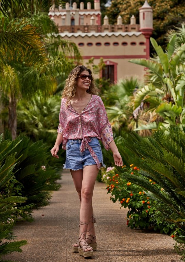 Figure flattering and ever so comfortable Orla Wrap Top, the soft musk colourway features delicate purple and white flowers on a soft pink background. Paired up with your cut-offs for daytime frolicking around town or dress it up with a long skirt and your favourite wedges.