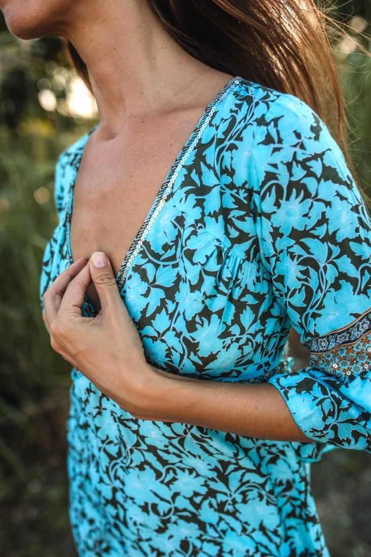 Avec des manches d'ange gracieuses et de magnifiques perles embellies à la main le long de la poitrine offrant une sophistication subtile. Choisissez parmi deux magnifiques tons de bleu ou de gris, dans notre superbe imprimé Soft Flowers.