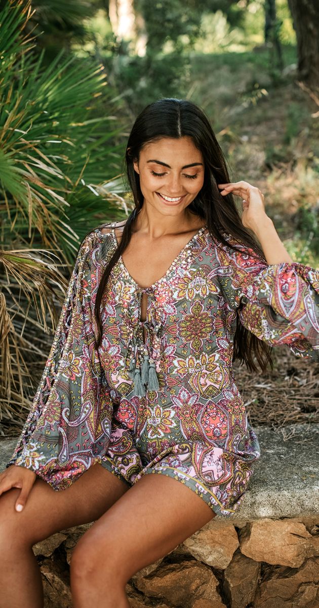 Sortez avec style dans notre combinaison courte Caly Paisley. Cette combinaison respire l'élégance et la classe. Fabriquée dans le plus doux des tissus en rayonne, elle est ornée d'un magnifique imprimé ethnique décliné en deux couleurs différentes.