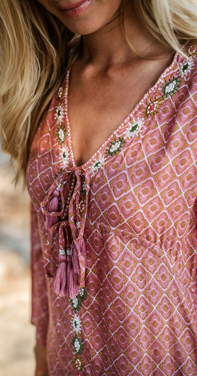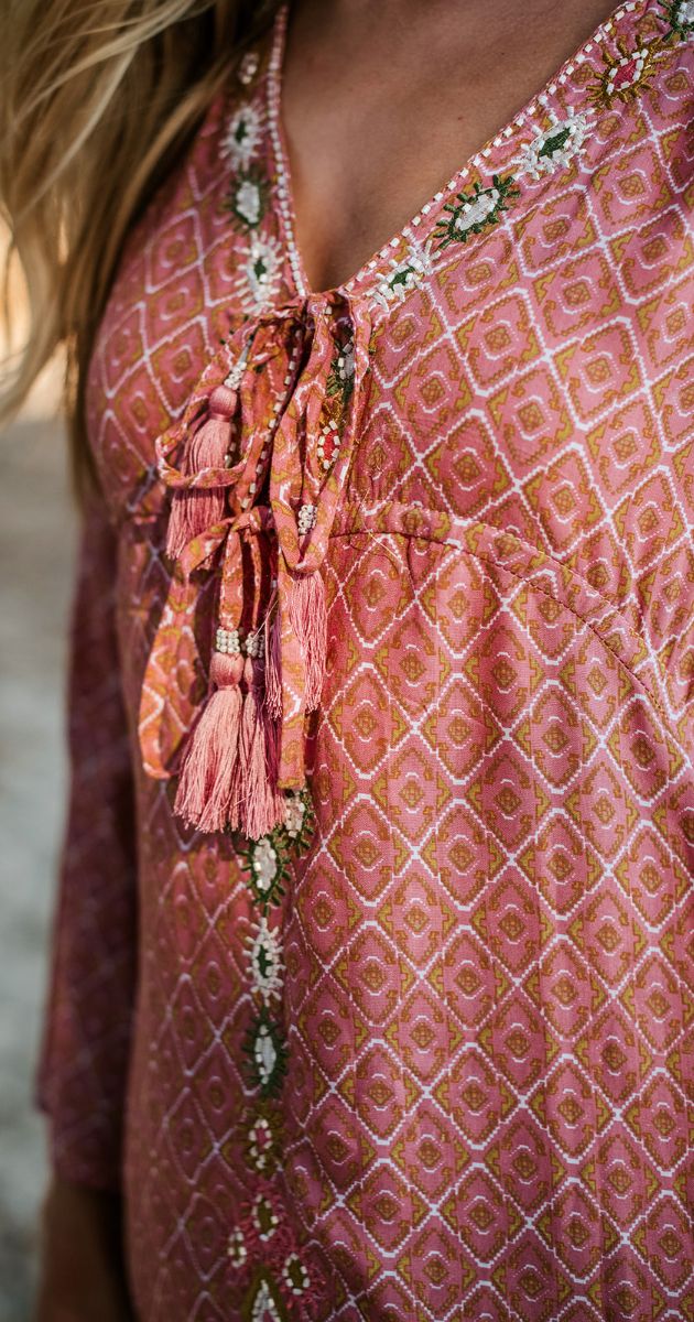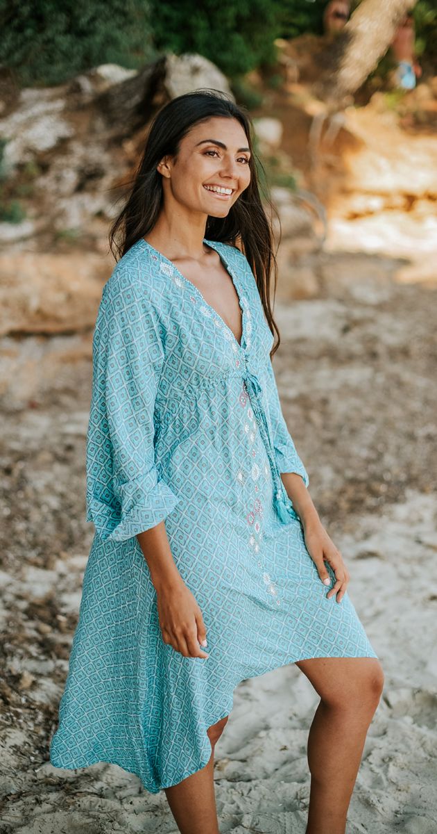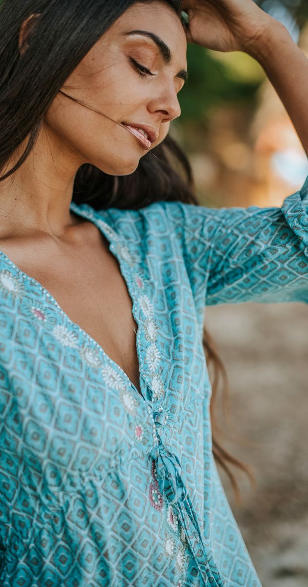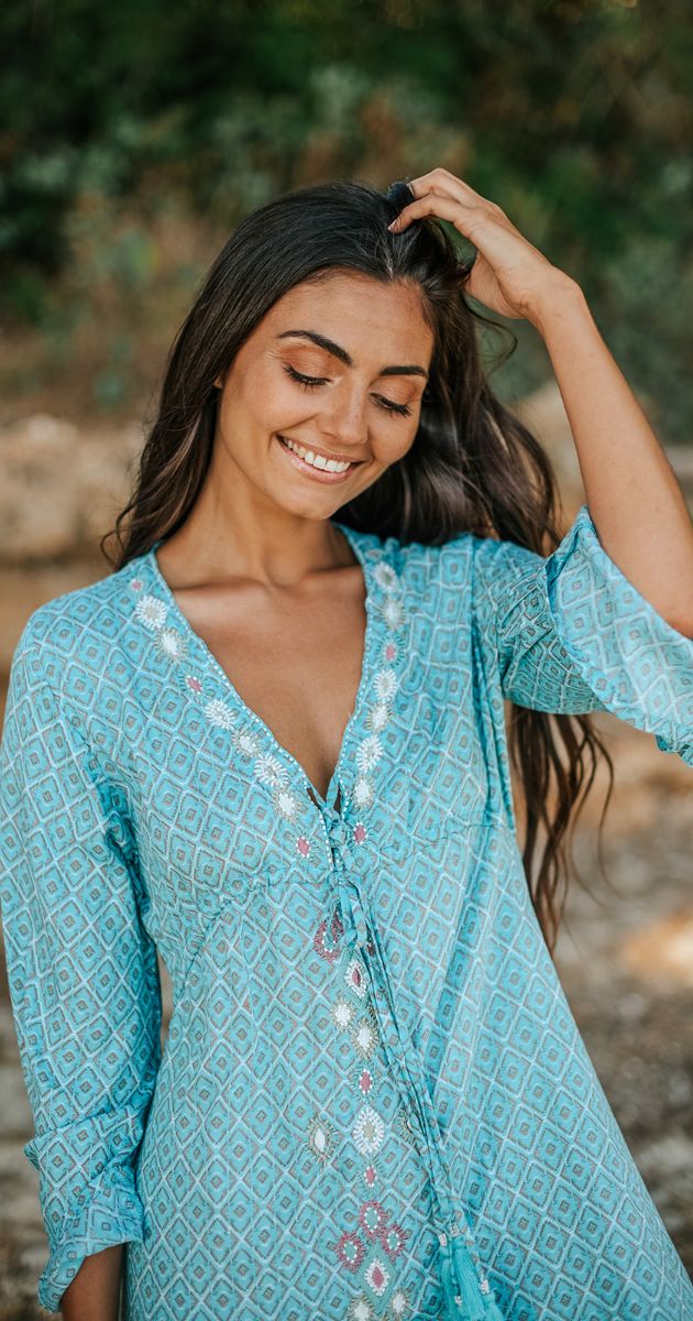 È realizzata in morbidissimo rayon, perfetto per mostrare la tua abbronzatura. Una scollatura a V riccamente ricamata rende questa tunica un'aggiunta molto elegante al tuo guardaroba estivo. Abbinata ai tuoi tacchi preferiti o a comode zeppe sarai pronta per la vacanza dei tuoi sogni.