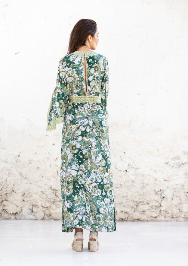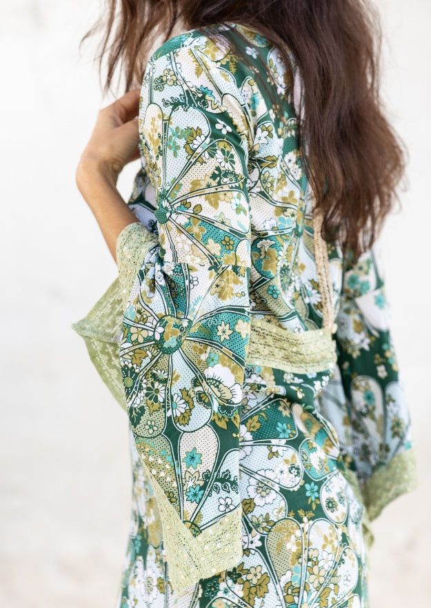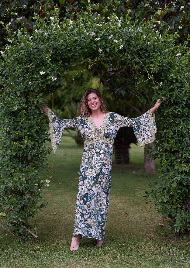 Scegli il tuo preferito tra le tonalità verdi o grigie della nostra stampa artigianale Tanit Tie Dye o Gertrudis di ispirazione vintage in nero e verde. Disponibile anche come abito a tunica Cora al ginocchio.