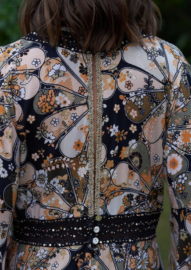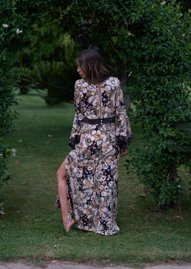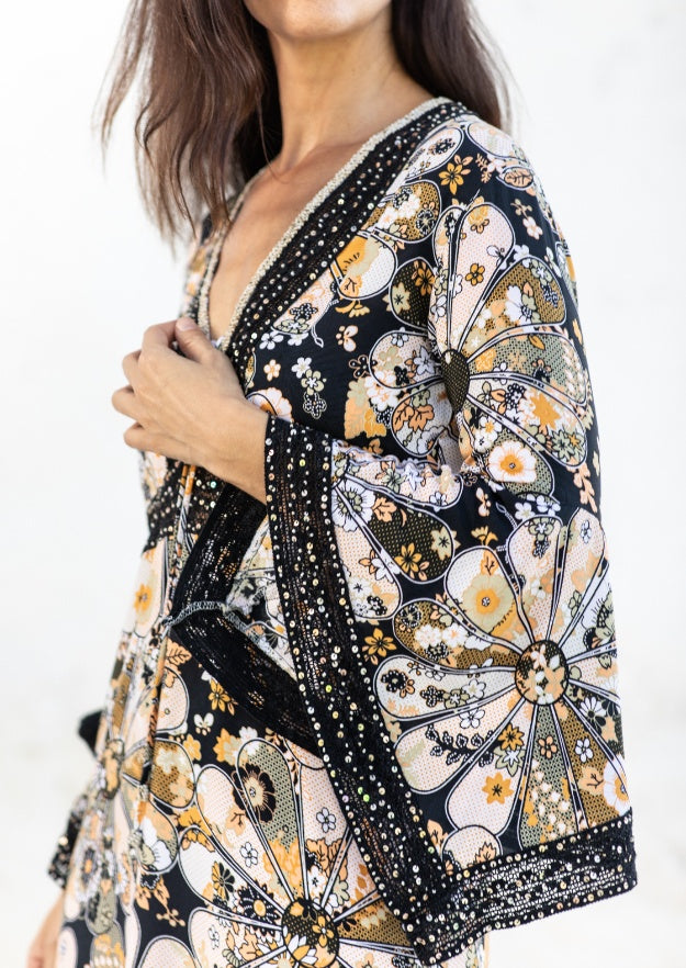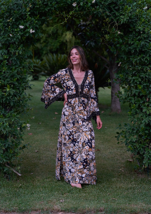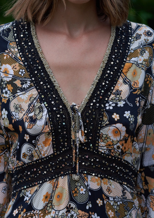 Un classico Hippy Chick, il Cora Kaftan è completamente accessoriato con una sofisticata spolverata di paillettes e perline lungo lo scollo, la vita e gli orli delle maniche. Con le maniche a campana, questo vestito è una vera ode alla tradizione della moda di Ibiza dallo spirito libero.