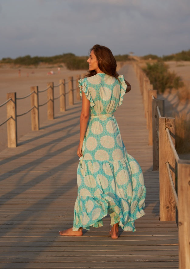Questa silhouette vintage di Hippy Chick Ibiza è lusinghiera, versatile e disinvoltamente bella: è l'abito perfetto da giorno a sera. Caratterizzato da un corpetto aderente e avvolgente e una gonna comoda fino al pavimento con orli a balze in squisite tonalità del blu del Mar Mediterraneo.
