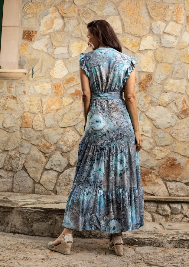 Questa silhouette vintage di Hippy Chick Ibiza è lusinghiera, versatile e disinvoltamente bella: è l'abito perfetto da giorno a sera. Caratterizzato da un corpetto aderente e avvolgente e una gonna comoda fino al pavimento con orli a balze in squisite tonalità del blu del Mar Mediterraneo.