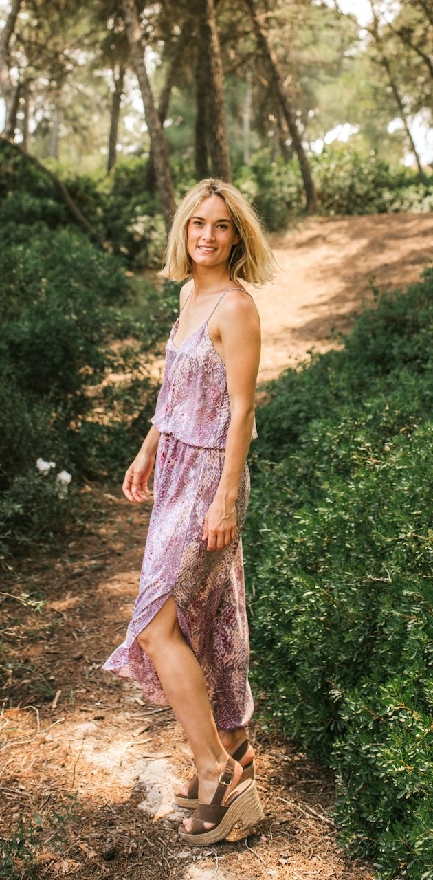 Simply elegant, animal print Karee dress has a classic front and sports a cool open back with crossed straps.Made from super soft rayon, it drapes beautifully around the ankles and can be easily styled with sandals or wedges. Choose your favorite between Blue and Cherry tones.