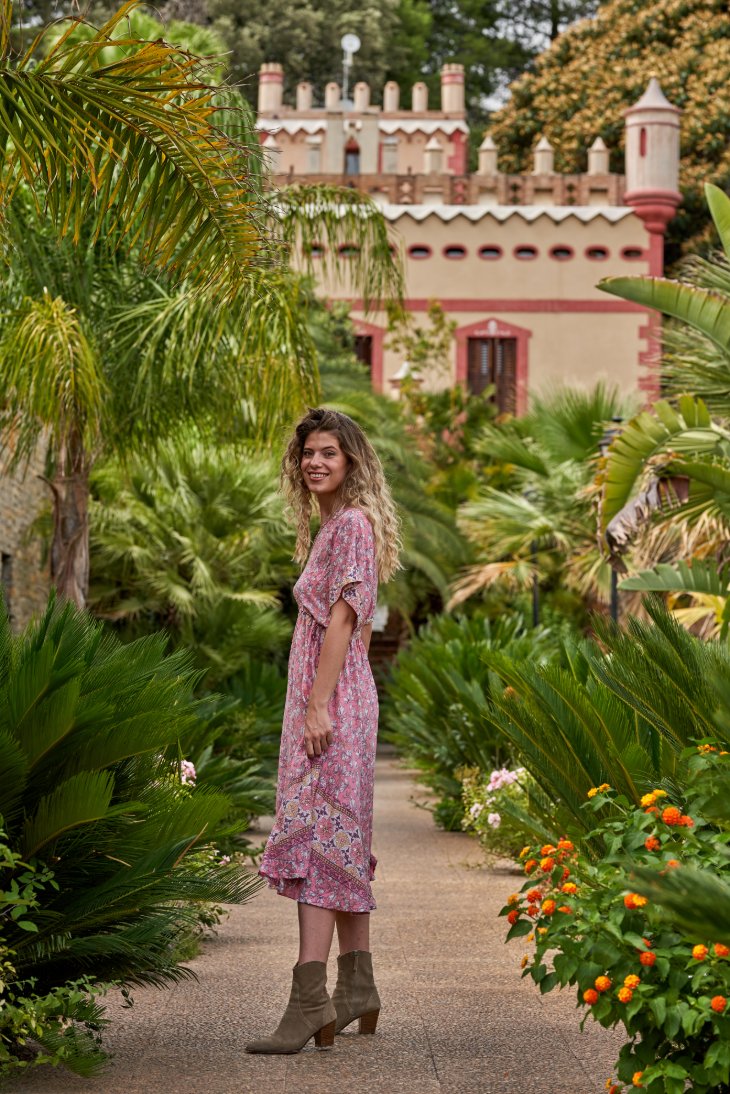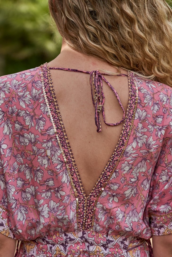 The flattering and ever so comfortable Koa Midi Dress is designed to accentuate the waist and bust without being too revealing. Features delicate purple and white flowers on a soft pink background, an absolute summer garden dream.