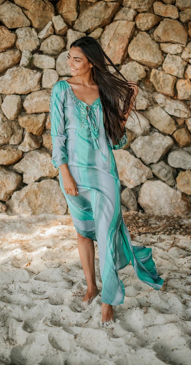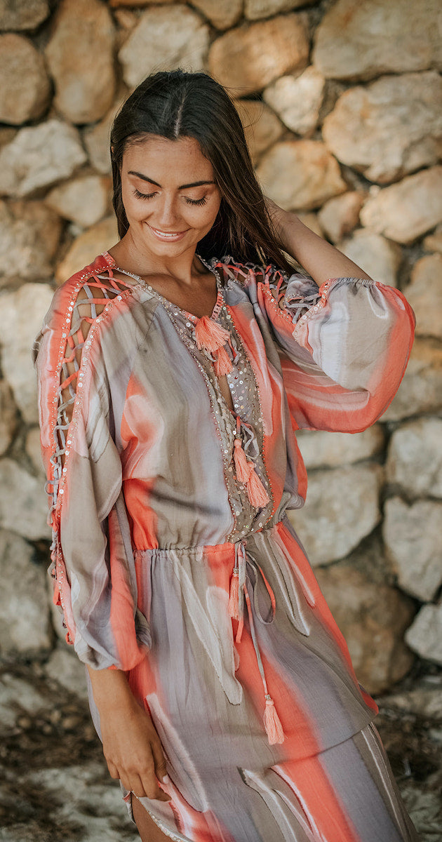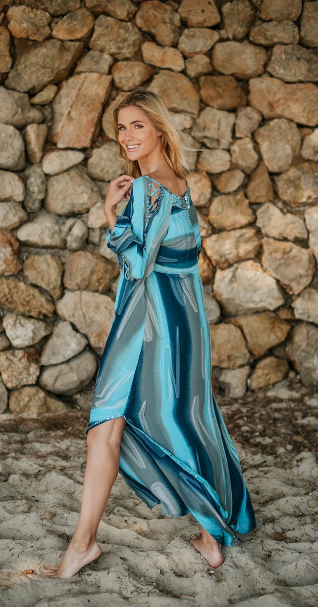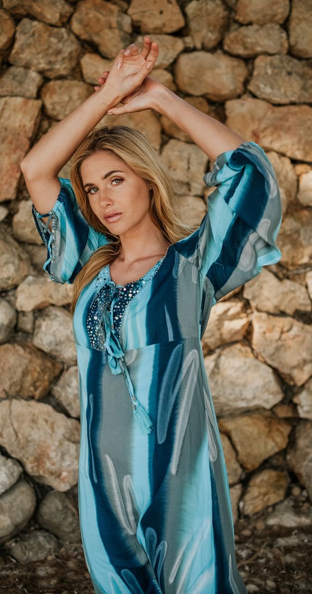 Avvolgiti con stile nella tunica lunga Leda. Questo abito lungo trasuda eleganza e classe. Realizzato con il più morbido tessuto di rayon, dipinto a mano con un motivo batik originale HCI.