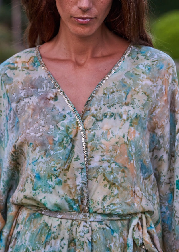 Disponibile nelle tonalità blu o oro nella nostra tintura artigianale Bora Tie Dye.