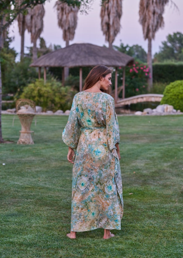 L'affascinante Lola Kaftan emana enormi vibrazioni di Alexis from Dynasty mentre passeggia a bordo piscina di una villa mediterranea quest'estate o come un glam up per entrare in una lezione di yoga mattutina a Ibiza. Indossato come un caftano mentre è legato in vita o casualmente sciolto come uno spolverino, il Lola Kaftan è lungo fino al pavimento e ha maniche corte ad ala.