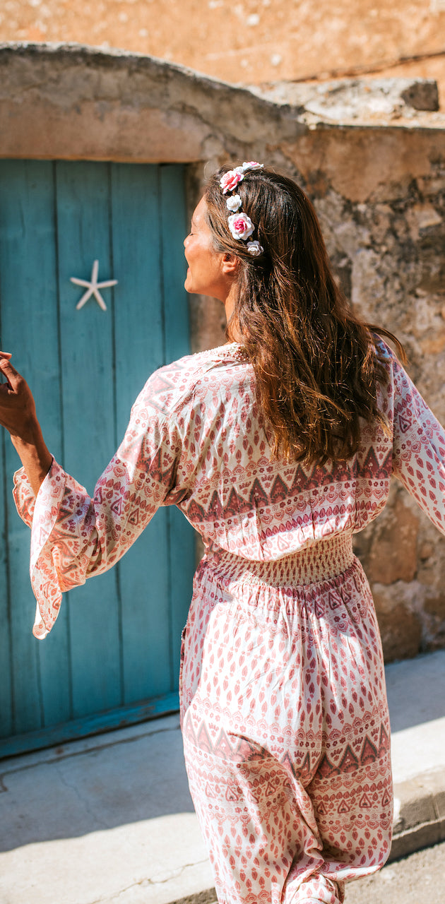 Tanit Jumpsuit is made from the softest rayon with a beautiful ethnic boho print. It features a broad fold-over fabric to tie around the waist for comfort. Long bell sleeves and sporting long wide pants, it is just effortlessly elegant. Choose your favorite from a Lilac tone or a more Greenish blue tone.