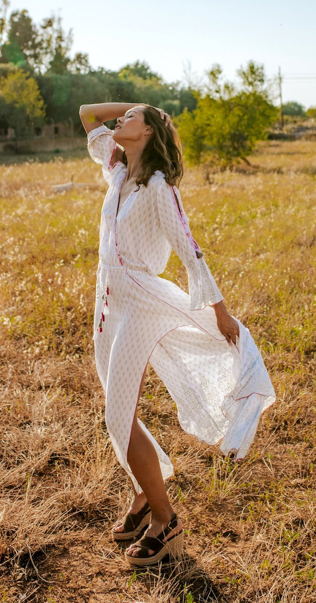 Wrap yourself in style in Long Abril Tunic. This long dress oozes elegance and class.Made from the highest quality rayon, she features glamourous open butterfly sleeves and richly embellished hem and neckline, this stylish tunic will never get overlooked and is effortlessly sexy.