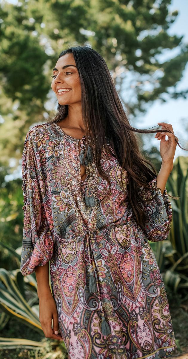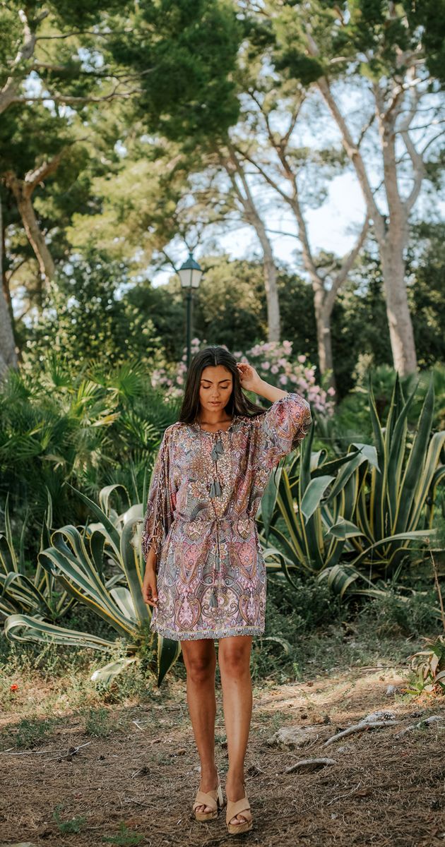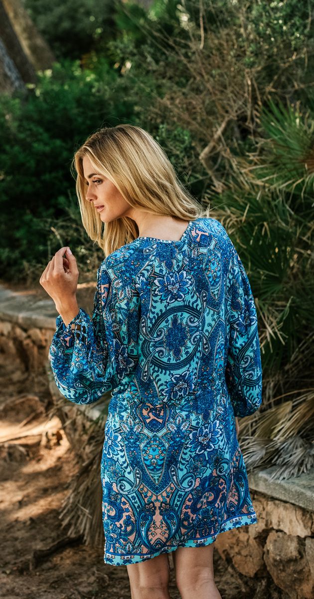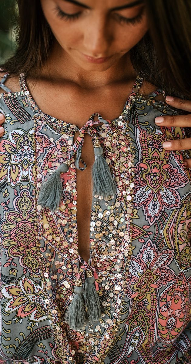 Questa fantastica tunica corta Meredith è un altro bellissimo pezzo della nostra collezione di designer. Il modello è lo stesso della versione batik dipinta a mano come la tunica Leda, ma questa linea è disponibile in un'intricata stampa mandala in 3 colori distinti. Caratterizzata da maniche intrecciate, riccamente impreziosita da bellissime perline a forma di squame di pesce lungo la scollatura e il petto. Regolabile con un sottile cordoncino sul davanti per rivelare tutta la scollatura che si desidera.