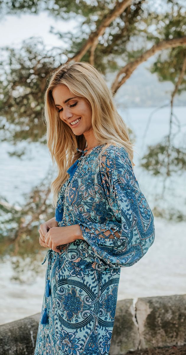 Questa spettacolare tunica è un altro bellissimo pezzo della nostra collezione di designer. Il motivo è lo stesso della versione batik dipinta a mano, ma questa linea è disponibile in un'intricata stampa mandala orientale in 3 colori distinti. Come la versione lunga della nostra collezione, ha le maniche intrecciate, riccamente impreziosite da bellissime perline a forma di squame di pesce lungo la scollatura e il petto. Regolabile con un sottile cordoncino sul davanti per rivelare la scollatura a piacimento.