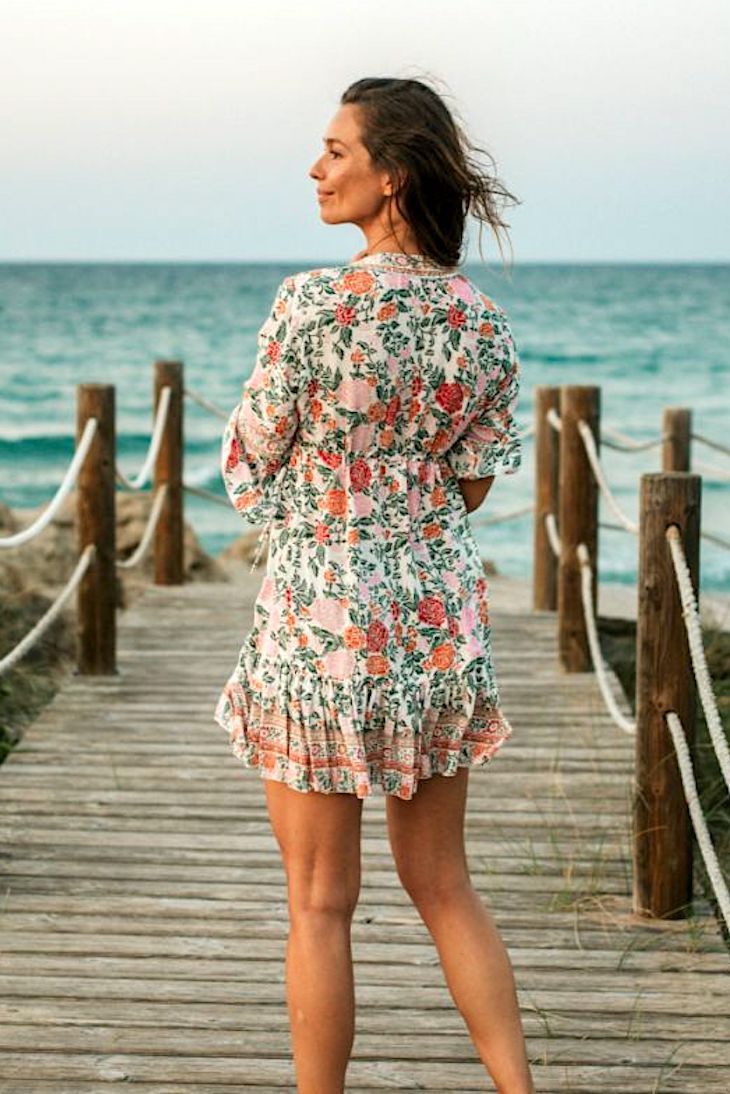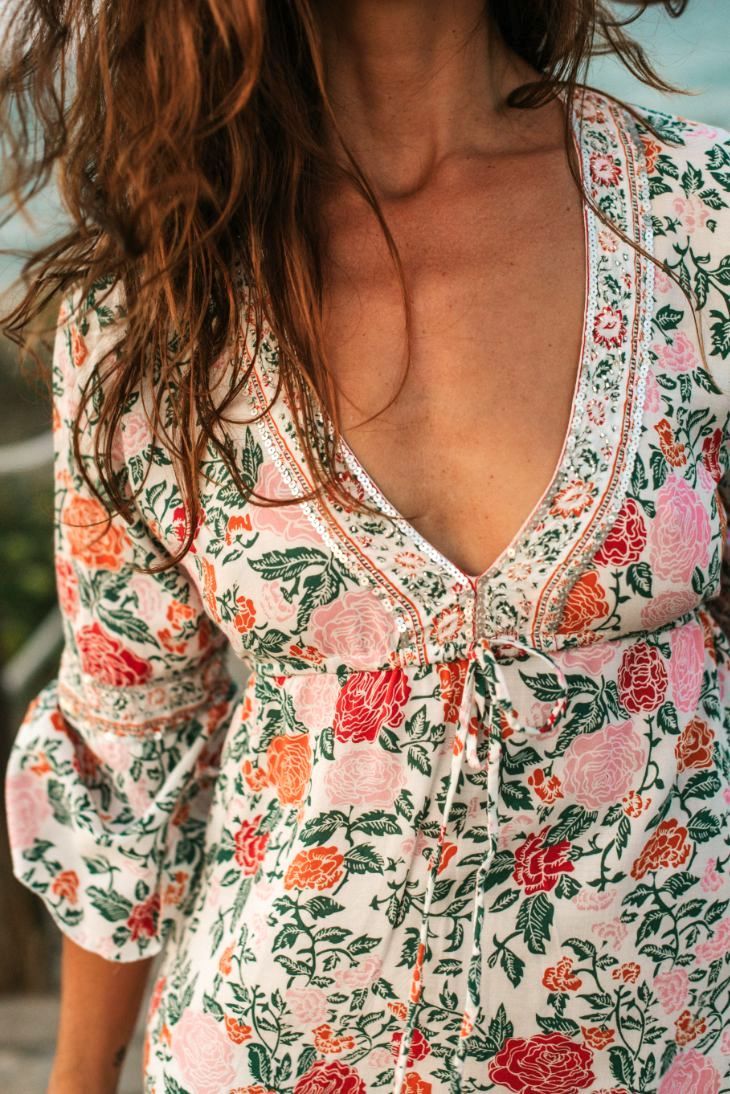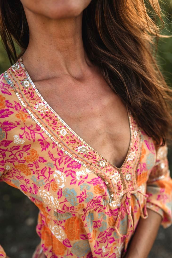 Lo splendido Saffron Short Tunique con stampa a fiori di terracotta sembra incredibile contro la tua pelle baciata dal sole. Con bordatura a mano lungo la profonda linea dello scollo a V, che offre un'intricata eleganza.