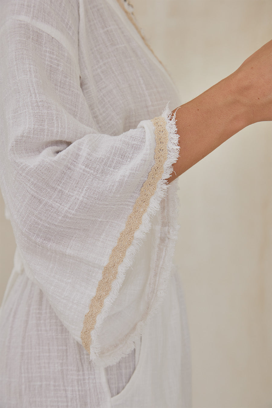 A romantic staple reimagined. The Flora Kimono Top in solids features delicate lace accents, wide sleeves and a relaxed fit. Wear it open, tied or as a breezy overlay — it adapts to every mood.
