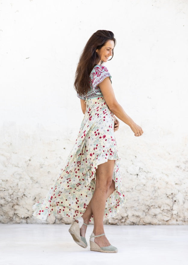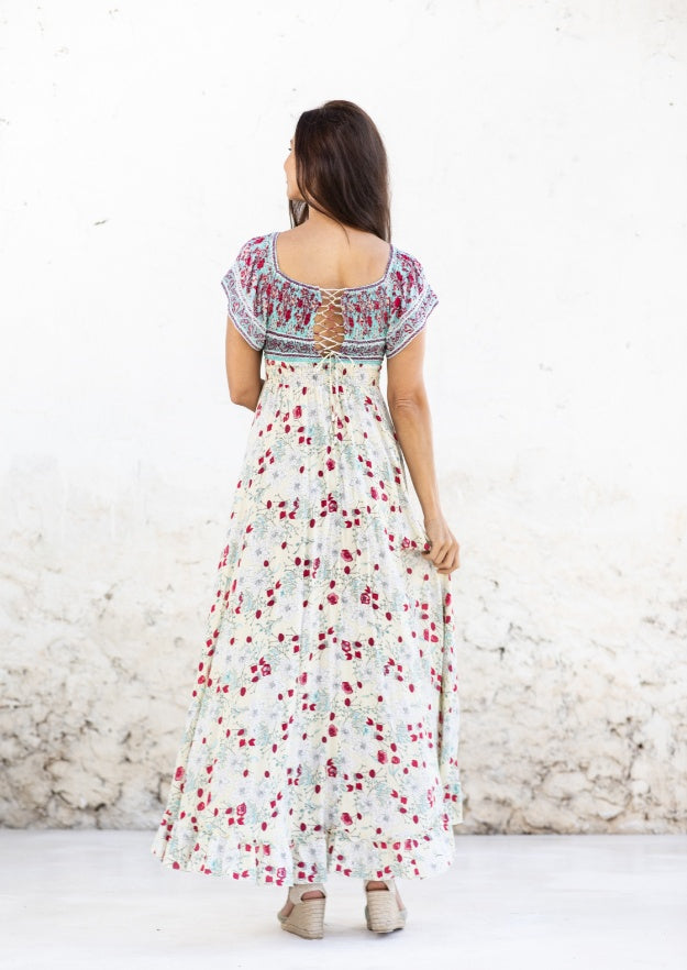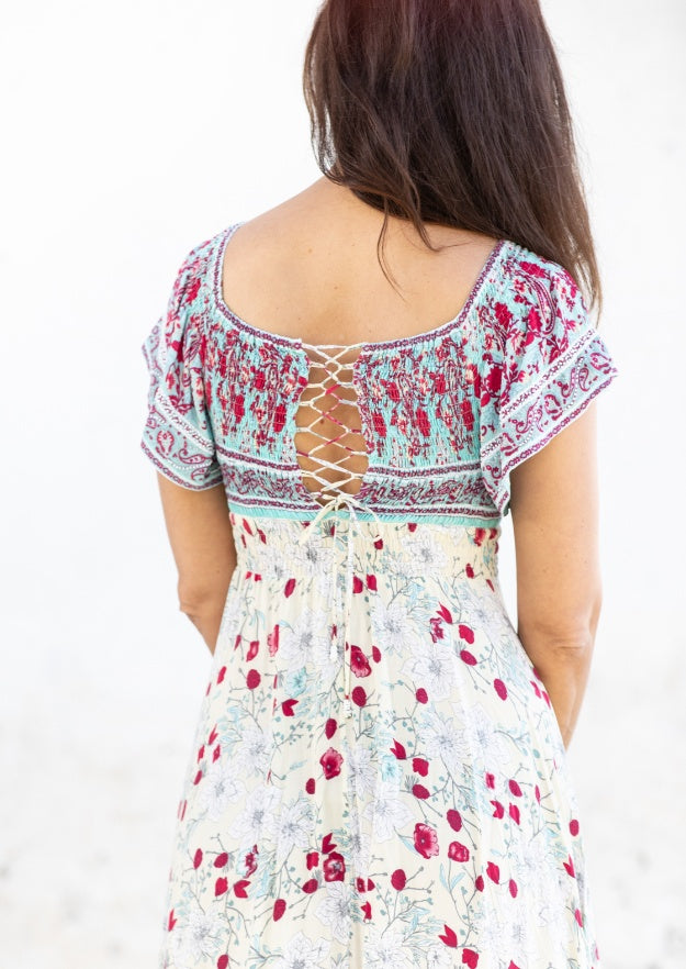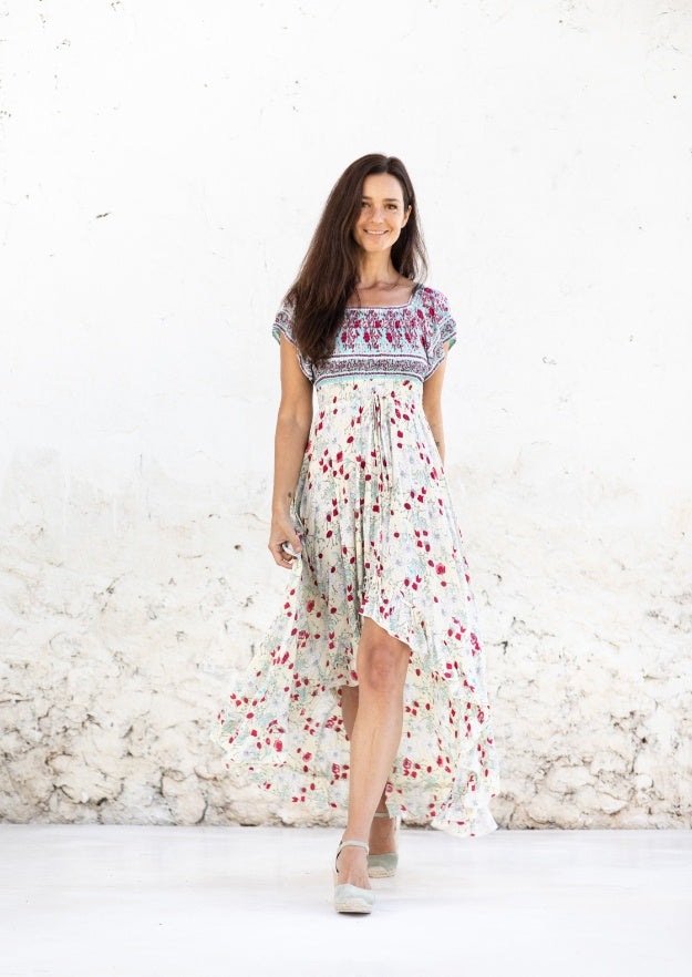 We just love this vintage-style floral Norah dress with its wide elastic smocked neckline that can be styled on, or off the shoulder. Featuring a bohemian strappy back, waterfall skirt and flirty flutter of the border mini hem. With ditsy floral motifs scattered across the print and luxurious floor-length draped fabric, this stunning piece is destined to be worn on repeat.